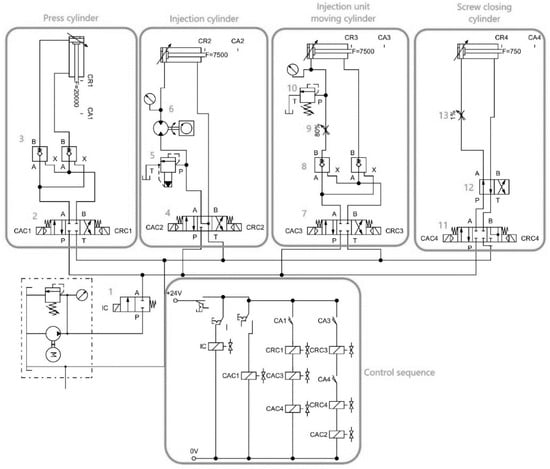 The production plant has a hydraulic circuit available at the ground floor to power the equipment. Thus, it is assumed that an oil tank and hydraulic pump are not required. As a result, the current design only deals with the selection of electro valves and respective accessories, and to propose the associated circuit. Figure 13 details the circuit proposal and corresponding control sequence for the injection machine.