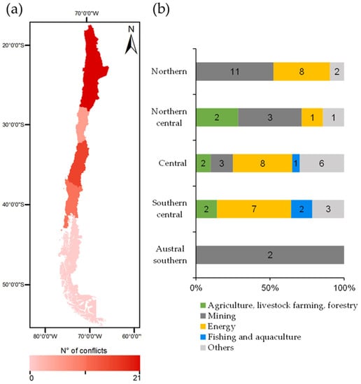 Social-environmental conflicts in Chile (adapted from the platform of the National Institute of Human Rights (INDH) []): (a) Map of Chile showing the number of social-environmental conflicts by geographical macroregion; (b) Relative participation of different industrial activities in social-environmental conflicts by geographical macroregion.