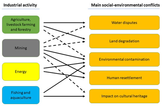 Summary of the main social-environmental conflicts associated with the industries analyzed. Solid and dashed arrows imply strong and medium relations respectively, according to our assessment.