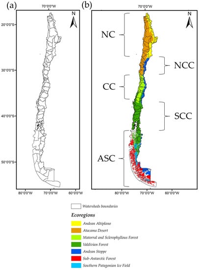 A potential land planning based on watershed boundaries. (a) Watershed boundaries in the national territory according to national reports [,]. (b) Map of Chile integrating watersheds within ecoregions (ecoregions adapted from []). Through this integration, five similar macro-regions are discerned: NC = Northern Chile; NCC = Northern Central Chile; CC = Central Chile; SCC = Southern Central Chile; and ASC = Austral Southern Central Chile.