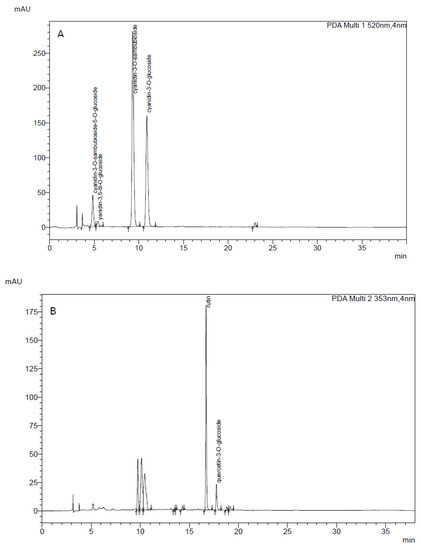 Composition of elderberry dry extract from batch B1, separated by using HPLC recorded at (A) 520 nm and (B) 353 nm.