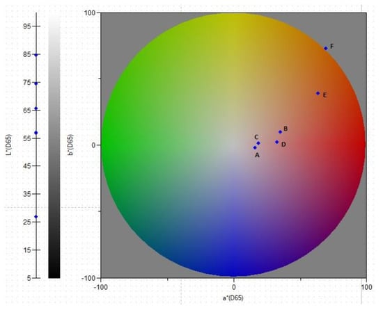 Hue angle plot of analyzed extracts at different pH: A—EDE B1 at pH 7.0; B—EDE B2 at pH 7.0; C—EDE B1 at at pH 4.5; D—EDE B2 at pH 4.5; E—EDE B1 at pH 1.0; F—EDE B 2 at pH 1.0.