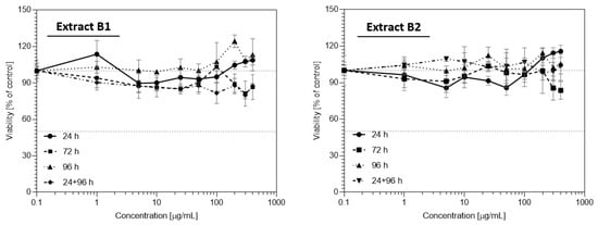 The effect of two batches of elderberry dry extract (EDE) on the proliferation of different cell lines was evaluated using tetrazolium assay (MTT). The multiple concentrations of extracts were used, and effective doses, expressed as IC50 value, were determined from the dose–response curve. As shown in Figure 4, Figure 5, Figure 6 and Figure 7, batches B1 and B2 of elderberry extract exhibited different cytotoxic potential towards the tested cell lines.
