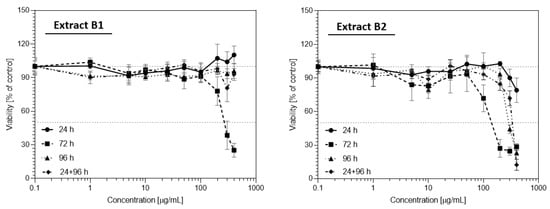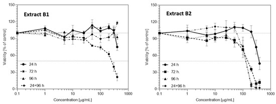 The most prominent difference in the cytotoxic properties of both extracts was demonstrated for colon cancer cells, HCT-116 (Figure 7). While the B1 extract had no inhibitory effect in all incubation times and concentration ranges, the B2 extract strongly inhibited cell proliferation to about 45% starting from 24 h of incubation. What is more, the B1 extract exhibited proliferation stimulatory properties towards HCT-116, starting from 50 µg/mL after 24 h and 72 h of incubation. Even though after 72 h and 96 h the B2 extract also slightly stimulated HC-116 cells proliferation in concentrations from 50–200 µg/mL, prolonged incubation resulted in cells viability decrease. What is worth noting is the fact that washing out a media with the extract B2 after 24 h of initial incubation and replacing it with a fresh media without extract, followed by 96 h of incubation, resulted in similar activity as constant incubation with the extract for 96 h. This indicates that the cytotoxic effect of the extracts starts within the first 24 h of incubation and a longer incubation only potentiates this effect. Further studies need to be conducted to explain this phenomenon as it may be related to the metabolic transformation of the extract in the cells and the induction/inhibition of membrane transport proteins.