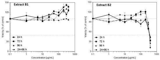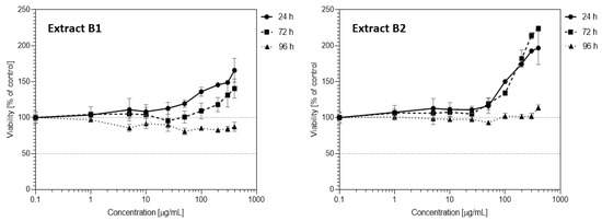 In order to evaluate the sensitivity of normal immunocompetent cells involved in the antitumor immune response, the cytotoxicity of elderberry extracts was also tested against healthy peripheral blood mononuclear cells (PBMC). Data presented in Figure 8 show that both extracts stimulated proliferation of the PBMC cells starting from a concentration of 100 µg/mL. Stronger stimulatory properties were observed for the B2 extract, where after 72 h of incubation, viability reached about 230% against about 170% for the B1 extract. Interestingly, for both extracts, incubation with cells for 96 h had almost no effect on cell proliferation.