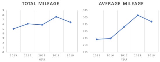 For each year, the mileage of trips made with vehicles belonging to the same COPERT 5 vehicle category was aggregated (the mileage of the “Other” category was broken down as indicated before).