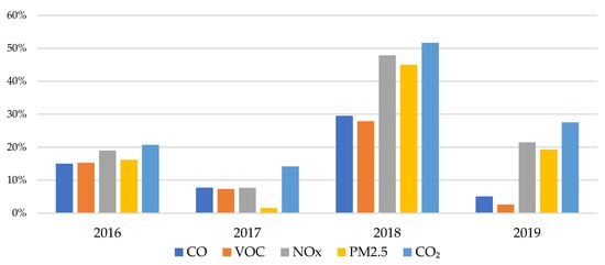 The estimates of pollutants are shown in Table 6. They varied steadily from year to year but showed similar behavior among them: the starting year recorded the lowest value for all pollutants; in 2016, there was a general growth, followed by a recession in the following year; 2018 was by far the highest year for all emissions; finally, 2019 was probably the year that most characterized the behavior of individual emissions, with some returning to values close to those recorded in the starting year, while others showed a smaller decrease while maintaining their high value. This behavior can be seen in the following graph (Figure 2), where the percentage growth of each pollutant is shown, taking 2015 as the base. Specifically, CO2 was the pollutant with the highest growth in all the years considered, even reaching an increase, in 2018 compared to 2015, of 51.6%, and closing the period with a growth of 27.5%; the pollutants that conversely showed a most modest increase throughout the time interval (except for 2017) were CO and VOCs, which, despite, this showed a growth of 29.5% and 27.8%, respectively, in 2018, with a further increase in 2019 of 5% for CO and 2.6% for VOCs.