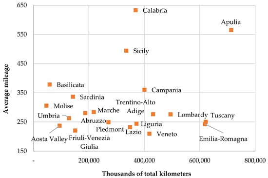 Kilometers travelled and average mileage to travel to the region of destination (2019). Source: ISPRA elaboration on ISTAT data.