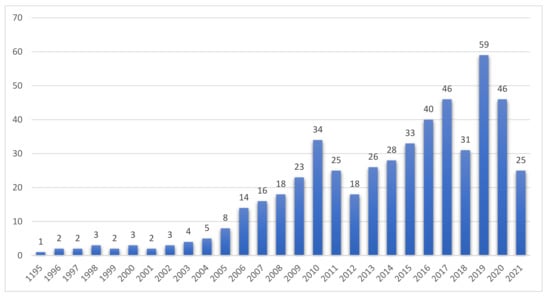 Table 1 classifies the information extracted from the WoS with 518 documents between 1995 and 2021 (August 2021). These documents were published in 227 different sources. The keywords mentioned in the publications were about three times the number of publications, a total of 1127. A total of 1272 authors were identified, 46 of whom worked alone, while 1226 wrote their articles in collaboration with others.