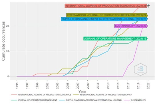 In order to evaluate the influence and impact of different journals in this field, the number of publications of each journal was calculated. As Table 3 shows, the top four journals cover the highest number of articles. The 518 articles reviewed in this study have been published in 227 different international scientific journals in the field of operation management. Of those, 232 articles were published in 20 journals, which can be seen in Table 3. The analysis demonstrates that the highest number of articles has been published in the “International Journal of Production Economics”, the “International Journal of Production Research”, “Supply chain Management—an International Journal”, “Sustainability”, and “Journal of Operations Management”. Figure 3 shows the increasing number of articles published in these five journals by year.