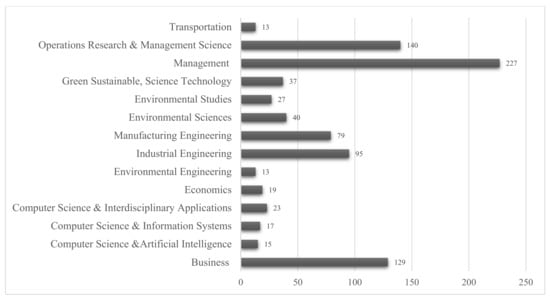The analysis of research areas and subject co-occurrence helps to explore disciplines that play a part in the expansion of a certain knowledge area [47]. Figure 4 shows the network of research areas based on the field of study. The analysis demonstrates that the 518 articles can be divided into 72 categories. As shown in Figure 4, the top-5 categories are “Management”, “Operations Research & Management Science”, “Business”, “Industrial Engineering”, and “Manufacturing Engineering”. These results demonstrate that this field of research is an interdisciplinary subject. Research is interested in the perspective of “business”, “economics” “operations research and management science”, “engineering”, and “computer science” to study alliances and resilience. The field can also be studied from other perspectives, including “environmental sciences”, “green sustainable science technology”, and “transportation”.