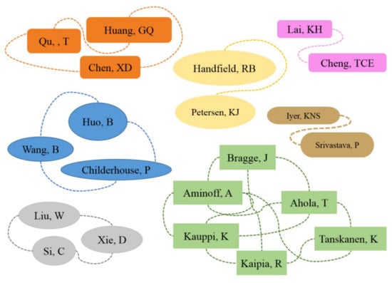 Furthermore, the collaboration between different scholars shows a network of effective research groups in the field. Co-author analysis is known as a way to determine patterns of collaboration in a field and the network of researchers and relationships among them [48]. The collaboration network analysis shows that there is a significant amount of co-authorship in this field. As Figure 5 shows that the most significant collaborations are between Huang, Gu, and Chen; between Huo, Wang, and Childerhouse; and between Liu, Si, and Xie.