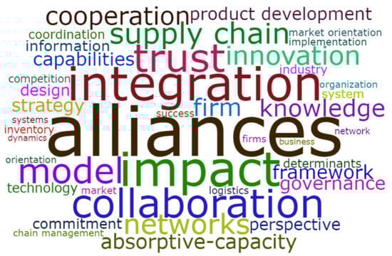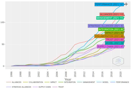 Figure 7 shows the change in research topics throughout time. In the late 20th century, for example, “alliance” and “integration” were the most popular keywords in this field of study. Between 2006 and 2016, however, the increasing use of keywords of “performance”, “management” and “strategic alliance” signals a higher interest in these topics, and from 2012 onward, research about “collaboration” has become more popular.