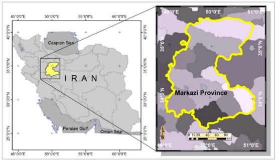 The study area is the Markazi province (34.6123° N, 49.8547° E), which is located in the center of Iran and covers an area of about 29 127 km2 with cold and dry climate. The Markazi province has 1.429 million inhabitants, of which 76.9% live in urban areas. The population density in the Markazi province is 49.1 people per square kilometer, which is almost the same as Iran []. Due to the special geopolitical location of the Markazi province in Iran and its proximity to the major cities of the country, this region is the industrial center of Iran and many important industries such as refineries, petrochemicals, aluminum, locomotive manufacturing, etc. are located in the Markazi province. On the other hand, due to these infrastructures, Arak city (center of the Markazi province) is ranked the 71st most polluted city in the world [] and is one of the most polluted cities in Iran.