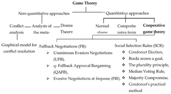 Unlike noncooperative game theory, which analyzes the actions and payoffs of individual players, cooperative game theory studies the collective actions and resulting collective payoffs of a group of players (or coalitions) []. A cooperative game is a mathematical structure formed by a group of players, a coalition, who can achieve a joint payoff that enforces cooperative behavior [,,]. In terms of measuring mutual effects between actors, cooperative game theory is considered an effective and valid method for equitably distributing costs and benefits to ensure system stability and sustainability []. Two well-known subclasses of cooperative games are the social choice rule (SCRs) and fallback bargaining rule (FB) classes (Figure 2) [,].