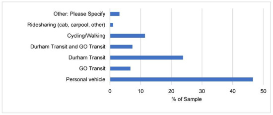 Over 220 adults completed the online survey. Of these, 68% were full time post-secondary students, and 86% indicated that the University campuses were their primary commuting destinations prior to the pandemic. The results of this study indicated that prior to the pandemic, the average commuting distance of this sample was 19 km/day (range: 0–110 km), with 59% of the sample indicating that they commuted daily and only 4% of the sample commuting 0 times per week. The primary mode of transportation was a personal vehicle (47%). Figure 2 shows the transportation modes used.