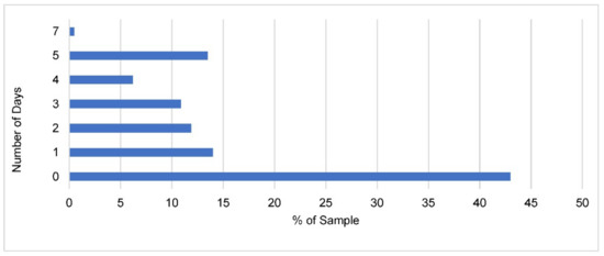 Due to the pandemic, 81% of the sample indicated that their primary daily destination changed. The number of days that participants in the sample commuted changed such that 43% were now commuting 0 days per week. Figure 3 shows the number of days the sample was commuting at the time of completing the survey.