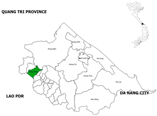 The local administrative units in Vietnam are provinces, districts, and communes. Each commune consists of several villages. The A Luoi district is located 60 km west of Hue city, the capital city of the Thua Thien Hue province. Approximately 56,500 people are distributed across one town and 20 communes. We selected the A Luoi district as our study site for the following reasons. First, the A Luoi district is one of the two mountainous districts in the Thua Thien Hue Province, and this district was the first one to implement PFES in 2014. Therefore, we expected that here we could reliably analyze the participation of locals in PFES. Second, the A Luoi District had a forestland area of 91,877.19 ha, corresponding to 75.00% of the district land area in 2019. The natural forest area in the A Luoi District accounted for more than 31.86% of the province’s natural forest area [29]. However, for many years, this district has been a hot spot for illegal logging and forest exploitation. Therefore, we considered that the A Luoi case study could illustrate the participation of local people in decision-making and efficiency of PFES for local livelihood improvement. Figure 1 showed the map of A Luoi district.