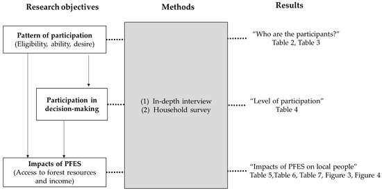 Figure 2 illustrates the analytical framework used in this study. According to Corbera’s equity, access could influence the participation of local people [32]. We used eligibility, ability, and desire as patterns to identify the extent of local people’s participation in PFES. Equity was not only about the participation but also about the inclusion and negotiation in the program [33]. Accordingly, we examined the decision-making process at each stage of PFES implementation. Finally, the livelihood improvement of local people was identified by the access to forestland resources and household income.