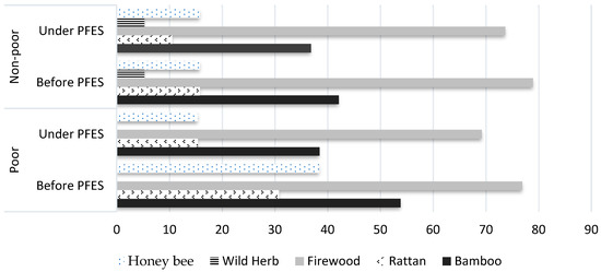 Regarding the access to forest resources, households no longer exploited timber after PFES. Many households said they had not gone to forests to exploit timber for many years since the government started to apply forest protection policies even before the implementation of PFES. Only poor households with a need for timber for house building submitted an application to local authorities to obtain permission to harvest timber in the designed area. Figure 3 shows the proportion of households that exploited NTFPs before and under PFES. The households collected NTFPs from both the contracted forest plots and non-PFES forests.