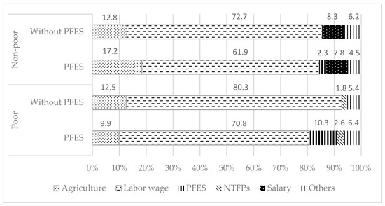 Figure 4 shows the household income distribution. It consists of six main categories: agriculture, labor wage, PFES, NTFPs, salary, and other sources of income (pension, allowance, etc.). There was no difference in the income distribution pattern between poor and non-poor households that received or did not receive PFES. Among the six sources, labor wage was the major paid non-farm household activity. The fraction of income earned as labor wages for the non-PFES households was higher than that of the PFES households for both poor and non-poor households. The labor wage contribution of poor households was higher than that of non-poor households (Figure 4).