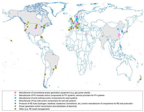 In terms of the business activity, about 52% of the companies are involved (directly or through their subsidiaries) in the power generation process, which includes the development, construction, and operation of power plants as well as the subsequent transmission and distribution of electrical energy. The second-largest group of companies (about 21% of the companies) are linked to the manufacturing of solar PV systems and their components (for instance, production of monocrystalline and polycrystalline silicon for solar PV cells, solar PV modules, inverters, storage systems, software, etc.). Apart from that, the third-largest group (10% of the companies) are developers of wind power generation systems. This group consists of companies, which, for example, design and manufacture blades and wind towers, construct wind turbines and wind farms, as well as provide various services to wind power generation companies.