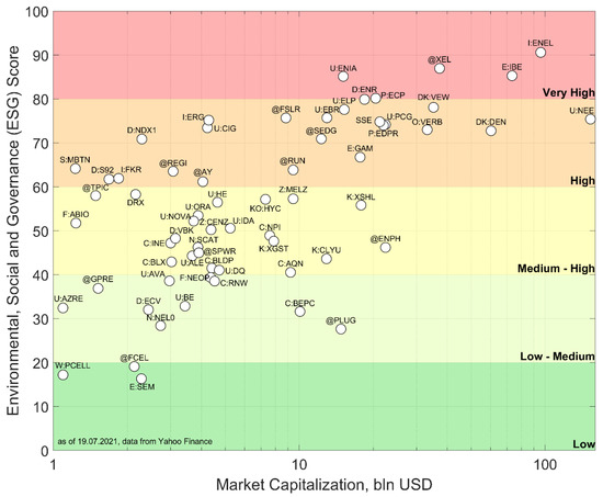 The ESG score takes values from 0 to 100 and is based on self-reported (but verifiable) information of companies on their performance in terms of environmental, social, and governance indicators. In particular, the environmental score contains components such as “resource use” and “emissions”, the social score elements such as “workforce” and “human rights”, and the governance component for instance the “corporate social responsibility (CSR) strategy” [24]. The point labels are the Datastream symbols for the companies (shorter than the complete company names) and the levels of ESG scores (from “Low” to “Very high”) were artificially created for this study for better representation of the ESG scores. The y-axis is on a logarithmic scale. In general, companies with larger market capitalization tend to be associated with higher Environmental, Social, and Governance (ESG) scores. One possible explanation for this could be that the operations of larger companies might be more in the public’s attention and more exposed, which may create pressure from stakeholders such as society, civil organizations, as well as from (potential) investors. Additionally, larger companies might be able to allocate larger financial resources to reporting tools for ESG rating agencies (for instance, to provide higher quality and more comprehensive data to better fit the ESG measurement systems). Apart from that, it could be that the management enumeration of larger companies may be more tied to the accomplishment of ESG-based objectives, thus incentivizing a stronger focus on ESG-conform activities and behavior.