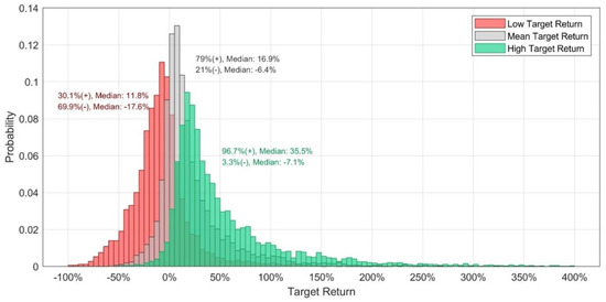 The average mean target return for the clean energy companies is 22.23% compared to the stock price at that time. It is unsurprising that the average low return is −8.12%, considerably lower, and the average high return is 58.20%, considerably higher than that. However, as Figure 3 illustrates, the magnitude of low, mean, and high target returns can differ considerably.