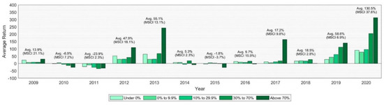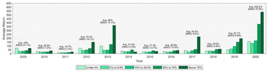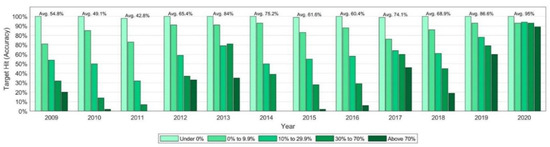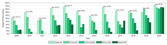 The average accuracies (target hit rates) are considerably less variable for the Year-Highest class than for the Year-End class and are also consistently higher in each year (see also Figure 5). The average accuracy ranges from 42.8% (2011) to 95% (in 2020) with an overall average return of 68.1%. The average accuracy for the “Under 0%” target return group is essentially 100% every year given that the stock price is already exceeding the target price at the start. The only exceptions are three observations for which the target return is only 0.2% to 5.1% below the stock price, which drops below it during the first day and never recovers from it. The tendency that lower target return groups are more likely to be met is even stronger for the Year-Highest target. It is noteworthy that the average accuracy for the “Above 70%” target return group is still often 2–3 times smaller than for the “Under 0%” and “0% to 9.9%” target return group. The average (highest) returns achievable displayed in Figure 8 follow a similar pattern to those for the average returns by Year-End in terms of the higher magnitude of average returns for the “Above 70%” target return group. The average returns for each target return group and year are positive, highlighting that, on average, stocks during the 12-month period at some point increased over their initial stock price. The correlation between the average Year-Highest returns with the MSCI world performance is still strongly to moderately positive (0.80, 0.41 excl. 2020).