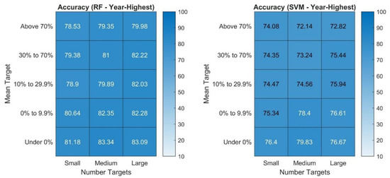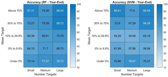 Similar to the Year-End average accuracies, the Year-Highest average accuracies also decline for higher target return groups. Moreover, the trend of higher average returns for higher target return groups can also be observed. The average returns for the Year-Highest class are for each target return group higher than those of the Year-End class (see Table 4), which is intuitive given that these correspond to the highest stock price during an entire year and not just those at the end of the year. The same holds true for the average hit returns and the average miss returns, which are all positive (with the single exception of the average miss return for the “Under 0%” target return group which, by definition, cannot be positive). As for the Year-End target, for the Year-Highest target the average hit and miss rates increase as the target return group increases. This highlights that clean energy stocks in the groups with higher mean target returns, which represent a more favorable analyst expectation than groups with lower mean target returns, also tend to achieve higher stock price increases over their 12-month periods. It is noteworthy that both the average as well as the median return increases with higher target return groups, highlighting that the distribution has a longer tail for the high positive returns (see Figure A1 in Appendix A). However, in contrast to the Year-End returns, the share of negative returns remains at a low, close to constant level for all target return groups.