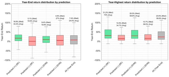 The performance of the random forest (RF) and SVM are compared to a simple random approach using the two-class probabilities. In particular, for each observation, a random uniform number is generated and if its value is below or equal to the first class’s probability, it is assigned to that class, and otherwise, it is assigned to the second class. This approach is taken to compare the random forest and SVM with a random approach but still account for the class sizes (especially for the Year-Highest class, which has a higher share of observations with the positive target class). The average classification accuracy, precision, and recall for the three models are displayed for each of the two targets (“Year-End” and “Year-Highest”) in Table 5. The results are based on 20 runs of a nested cross-validation (10-fold cross-validation split for the external and also the nested cross-validation).
