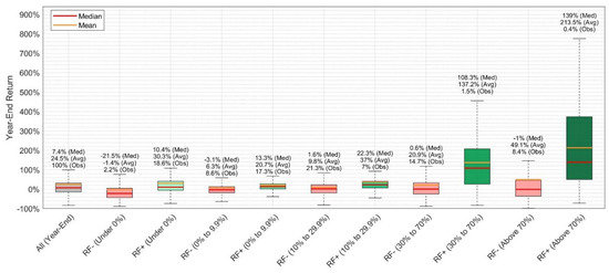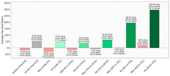 Overall, it is interesting to see that the higher average hit and average miss returns tend to outweigh the decrease in the average accuracies so that even when target prices are rarely met (e.g., in the “30% to 70%” and “Above 70%” target return group), the average hit return is so high, and the average miss return is still not so low as to lead to a lower average return overall. In other words, clean energy stocks in the groups with higher mean target returns, which represent a more favorable analyst expectation than groups with lower mean target returns, also tend to be associated with higher average returns until the end of the corresponding 12-month period. This trend still holds true if target prices from the exceptional year 2020 are excluded. However, this information only provides an incomplete picture of the returns in the target return groups. It is noteworthy that while the average return tends to be higher for higher target return groups, the distribution tends to be wider, with the median showing a decreasing trend and the share of Year-End returns below zero is increasing for higher target return groups (see Figure A1 in Appendix A). The fact that the mean tends to be further from the median for higher target return groups in the most extreme case for the “Above 70%” target return the mean even exceeds the third quartile shows that there is a long tail at the higher end of the returns. Thus, higher average returns are based on a comparably small number of very high Year-End returns. This illustrates that the risk associated with stocks in higher target return groups increases but so does the potential reward, as highlighted by the average returns.
