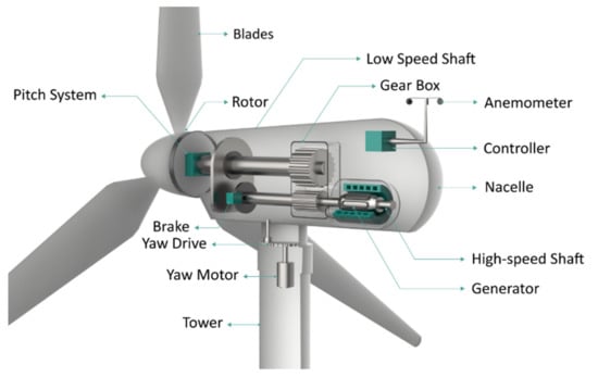 Wind turbines are mechatronic equipment that generate electricity from wind by first transforming wind power into mechanical power and then to electric power [] (Figure 1). Wind turbines can be constructed onshore (on land) or offshore (in the sea). The power output can range from a few hundred watts (W) in residential models to hundreds of kilowatts (kW) and even megawatts (MW) in commercial models []. The efficiency of a wind turbine is determined by how the individual parts are configured and designed, including the blades (which need to generate the greatest amount of torque), yaw control system (which helps in maintaining the orientation of the nacelle with respect to the wind direction), rotors (which rotate the shafts), shafts (which propel the generator), gears (which control the shaft speeds), brakes (which stop or decrease the speed of the machines), generator (which generates electricity), and anemometer (which is used to measure wind speeds) [,].