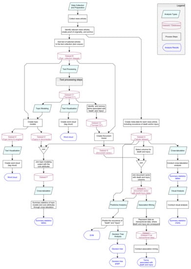 This section describes the process steps and methods of the data mining framework that was custom-developed in this research and successively applied for the analysis of wind turbine accident news. The framework, presented in Figure 2, integrates the various methods of text processing and data analytics introduced in Section 3 as a unified framework, such that it can be applied to similar datasets. As shown in the legend of Figure 2, each type of data analysis is represented with a parallelogram, datasets and databases are shown with cylinders, process steps are shown with rectangles, and analysis results are shown with cornered ellipsoids.