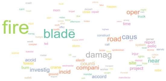 The work in [] applied text mining to analyze wind turbine service history (operation and maintenance (O&M)) reports and identified failure-associated words and terms. The authors analyzed data from wind turbines with generator or gearbox issues and applied decision tree and random forest classifiers to identify contextual words in failure situations. The ultimate objective of this research was to automatically detect possible failures. The work in [] is related to our research because of the use of text mining; while [] focuses on O&M reports for a subset of possible types of accidents for operational planning, our research considers news accidents for all possible types of accidents for strategic planning.