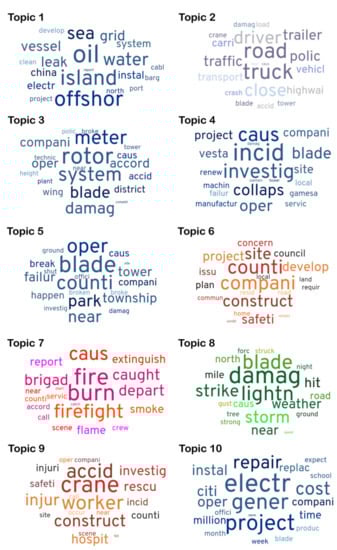 The motivation and objective of this study was to add to the stream of research [,] on the advanced analytical study of wind turbine accident news. The present research analyzes extensive recent and verified data and applies topic modeling and association analysis for the first time in the field. Thus, in this paper, we address the shortage of research regarding advanced studies of wind turbine accidents and develop a new understanding to be added to the body of knowledge on the topic. The research was aimed at providing practical and actionable insights to wind turbine manufacturers, service providers, energy companies, insurance companies, government bodies, non-profit organizations, researchers, and other stakeholders in the wind energy industry.