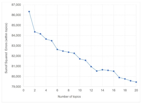 Topic modeling is an unsupervised learning technique that algorithmically analyzes and identifies prominent topics from a given collection of unlabeled text data. Latent Dirichlet allocation (LDA), developed in [], is a widely used probabilistic topic model that was selected and applied in the present research. In LDA, documents are thought of as a collection of different topics, where each topic is a group of associated words (terms) []. The technique provides the identified topics as the main output, the most important words in each topic, and their weights. The technique also outputs, for each document in the text collection, the weights of the identified topics for that document. Topic modeling has proven useful in automatically detecting topics from text collections (corpi) in various application domains, including the analysis of text collections relating to accidents [,,,,,].