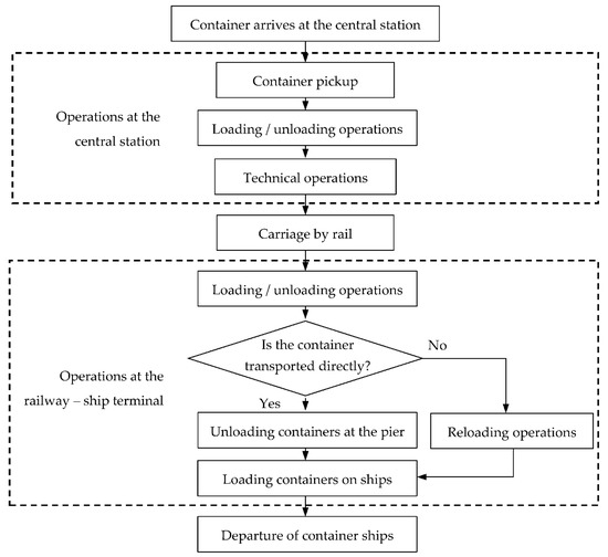 Figure 1 presents the scheme illustrating how goods are carried by way of maritime–rail interoperability. Freight is carried by sea in containers. It is brought to an embankment—a container terminal, and containers are unloaded at the pier using stevedoring equipment. Containers are then carried to the railway station which is located on the opposite side of the port, where they are filled with partial freight, loaded onto wagons, and further carried by rail [12].