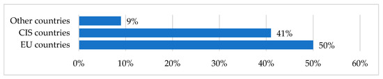 Respondents’ answers revealed that most of the freight is carried to and from the European Union countries (50%), but a significant share, as many as 41%, is carried to and from the CIS countries. 9% of respondents answered that they carry freight to other countries. Thus, it was also important to find out what mode of transport they use to carry freight (Figure 3).