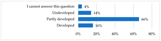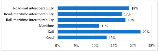 Figure 5 reveals that dry-cargo ships are the most popular among respondents, with 45% of the respondents having chosen this answer. Tanker ships (tankers, gas vessels) (16%), combined cargo ships (14%) and specialized dry-cargo ships (refrigerators, Ro-Ro, bulk carriers) were a less popular choice, which allows the conclusion that the most popular ships are those for carrying containers, which in turn contributes to the organization and simplification of transport interoperability. It was also important to find out what respondents thought about the level of development of maritime and rail transport interoperability (Figure 6).