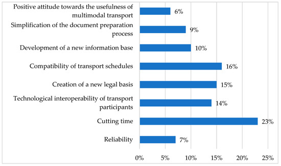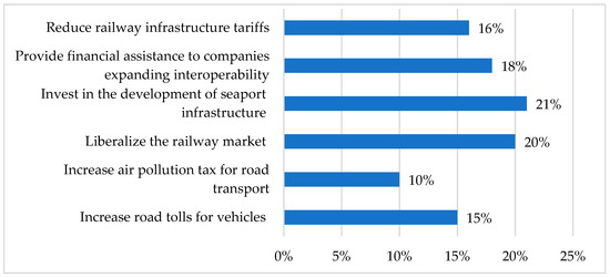 Respondents believe reducing time to be the most important factor (23%), many respondents indicated compatibility of transport schedules (16%), creation of a new legal framework (15%) and technological interoperability of transport participants (14%) as important. Less popular but also important options were the development of a new information base (10%), simplification of the document preparation process (9%), reliability (7%) and a positive attitude towards multimodal transport (6%). In addition to these factors, a greater support from the state was also expected. Therefore, it was important to assess which additional state measures would have an impact on promoting the use of maritime and rail transport interoperability (Figure 9).