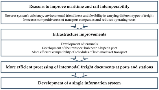 These and other aspects are important not only for Lithuania, but also for other countries, which must ensure a smooth interaction between maritime and rail transport. Therefore, four main steps must be taken to ensure the integration of maritime and rail transport systems (Figure 10).