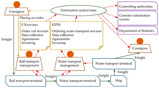 A unified technology combining the work of the seaport and railway stations is of particular importance in the interoperability between maritime and rail transport, and information systems (IS) could help to unify the work of these points [23]. However, maritime and rail transport each use different IS, so exchange of information depends on staff alone. In order to organize joint maritime and rail transport activities, ensure their smooth operation, and disseminate information requires combining two ISs related to the transport operators (“e-Krovinys” (e-Freight) and “KIPIS”) [24]. This would create a common database that would be useful for organizing freight carriage by rail and maritime transport.