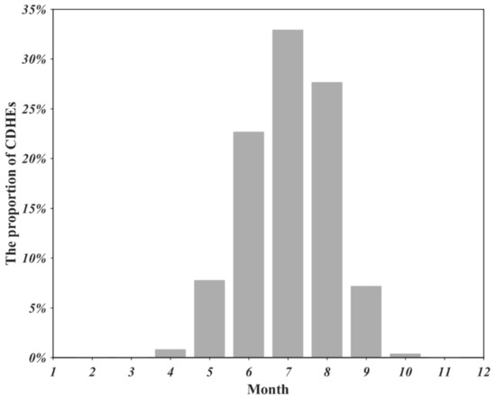 The proportion of CDHEs in different months for the period of 1961–2018.