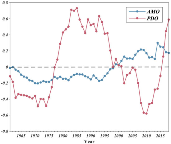AMO and PDO are major large-scale circulation patterns that influence the climate of East Asia. The AMO index is defined as the average anomalies of sea surface temperature (SST) in the north Atlantic [28]. Its positive (negative) phase usually indicates that SST is warmer (cooler) than the average SST across the north Atlantic Ocean. The PDO index is defined as the leading principal component of the north Pacific (NP) monthly SST anomalies [29]. Its positive (negative) phase corresponds to cool (warm) SST in the central and western NP. In this study, we found that more than 83.5% of CDHEs occur during June, July, and August (JJA) in China (as shown in Figure 1); thus, we focused on the impact of the AMO and PDO indexes in JJA on CDHEs, where the temporal series of the AMO and PDO indexes in JJA are derived from the China National Climate Center (http://cmdp.ncc-cma.net, accessed on 18 November 2021), and shown in Figure 2.