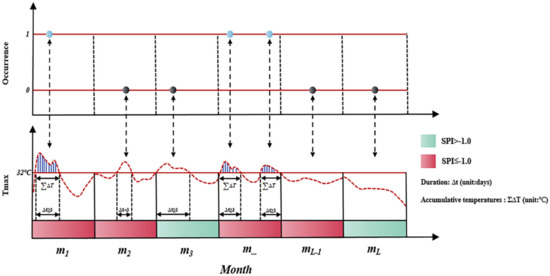 The schematic diagram of CDHEs. L is the total number of months for the period of 1961–2018. The top y-axis represents the occurrence of CDHEs, 1 for occurrences and 0 for non-occurrences. The bottom y-axis represents the maximum temperature. represents the duration of a CDHE and represents the accumulative temperatures of a CDHE.