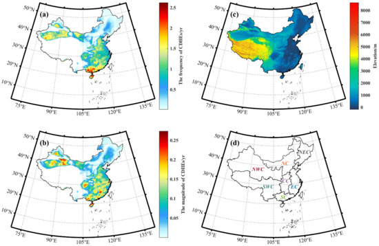 The spatial distribution of the mean annual frequency (a), mean annual magnitude (b) of CDHEs for the period of 1961–2018, elevation (c) and seven regions (d) in China.