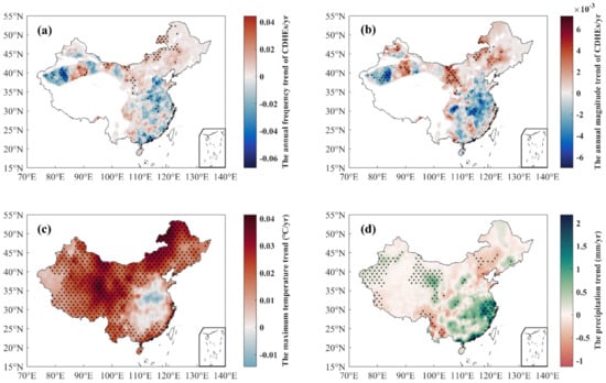 Trend analysis of the annual frequency (a) and annual magnitude (b) of CDHEs, and the maximum temperature (c) and precipitation (d) during JJA for the period of 1961–2018 in China. Black dots indicate statistical significance at a 0.05 significance level.