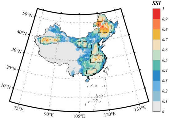where represents the accumulative temperatures of a CDHE, is obtained using a nonparametric method to estimate the cumulative density function (CDF) of , transforming to a non-exceedance probability ranging from 0 to 1. A larger value corresponds to a higher probability of [31]. The degree of drought is represented by monthly SPI. proposed by the runs theory [32,33] is the absolute value of the difference between the SPI for the month in which the CDHE occurs and the drought threshold. Therefore, a larger indicates a more severe drought. DHMI can also be treated as a weighted value of , so its maximum value is the maximum value of .