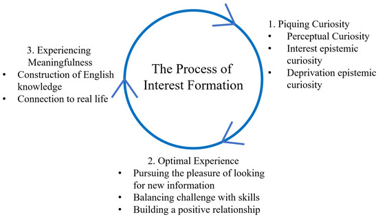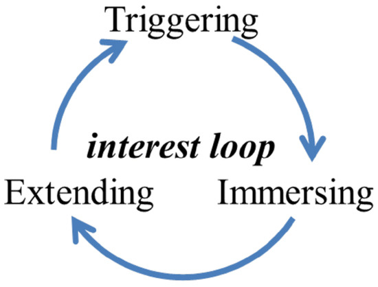 Interest is an important component in a technology-supported learning process [30]. When students’ interest is triggered during learning, they can become immersed in the learning process and their interest can be extended to new learning [30]. There are many studies which focus on situational or individual interest in the investigation of interest formation in various contexts [31,32]. Rotgans investigated the development process of situational interest in an active learning environment [33]. In this study, sixty-nine polytechnic students in a problem-based learning session were evaluated to find out how situational interest would develop during a one-day experimental study. The results showed that situational interest was significantly enhanced because of the problem stimulus provided. Subsequently, situational interest gradually decreased but increased again at the end of the day. Korsun investigated the transformation, when learning physics, from situational interest to personal interest in the context of sustainable development of education [34]. In the study, the sequence of interest formation was analysed in terms of multiple steps, including curiosity, active curiosity, trying to understand, gathering strong knowledge, and conducting scientific research. The process represents the transition from situational interest to individual interest. The study revealed that active training and active learning methods, such as heuristic conversation and the creation of problematic situations, increased the level of motivation in the learning of physics. In these studies, the theory of interest development [35] and the scheme for the formation of learners’ interest [36] were used as frameworks, which both assume that the development of interest formation occurs linearly. But is this so in all learning environments?